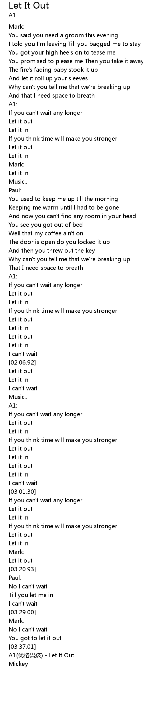 | [03:38.77] | A1(优格男孩) - Let It Out |