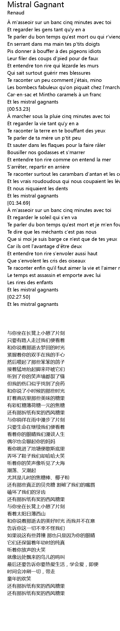 | [00:13.44] | À m'asseoir sur un banc cinq minutes avec toi |