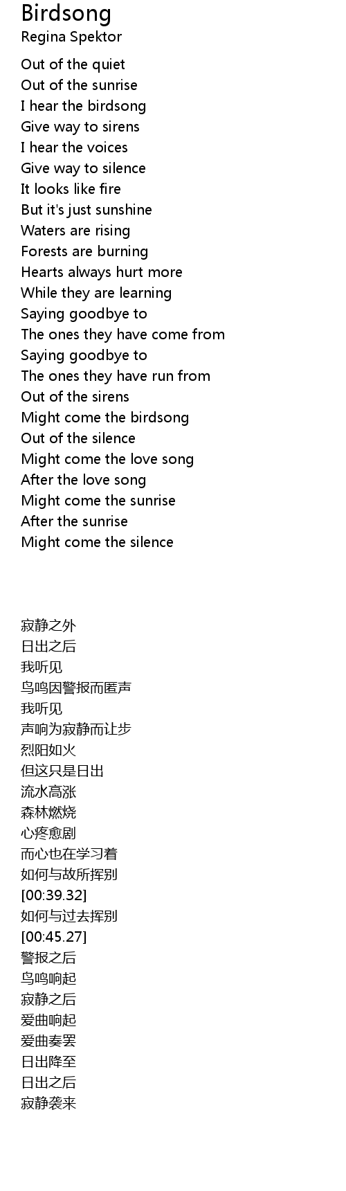 | [00:06.41] | I hear the birdsong |