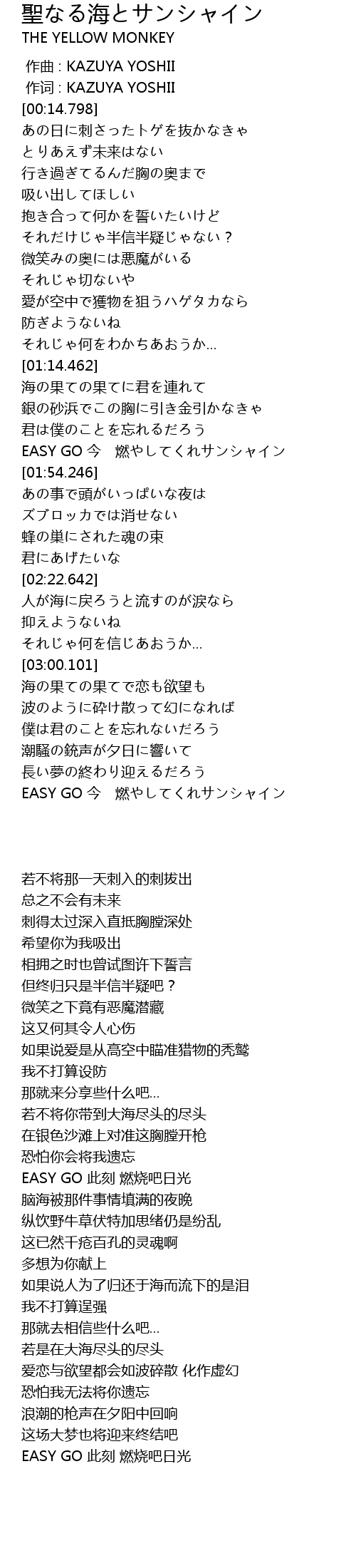 | [01:44.006] | EASY GO 今 燃やしてくれサンシャイン |