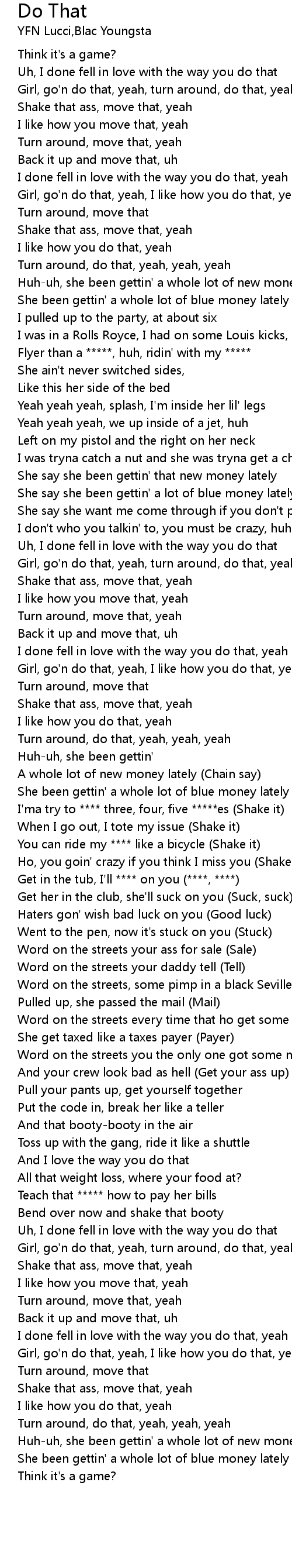| [01:44.96] | She been gettin' a whole lot of blue money lately (Shake it) |