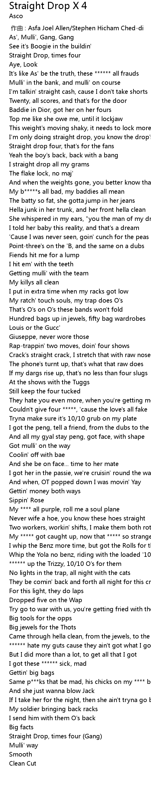 | [02:17.26] | My **** all purple, roll me a soul plane |