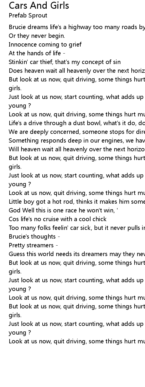 But look at us now, quit driving, some things hurt more much more than cars and girls. |