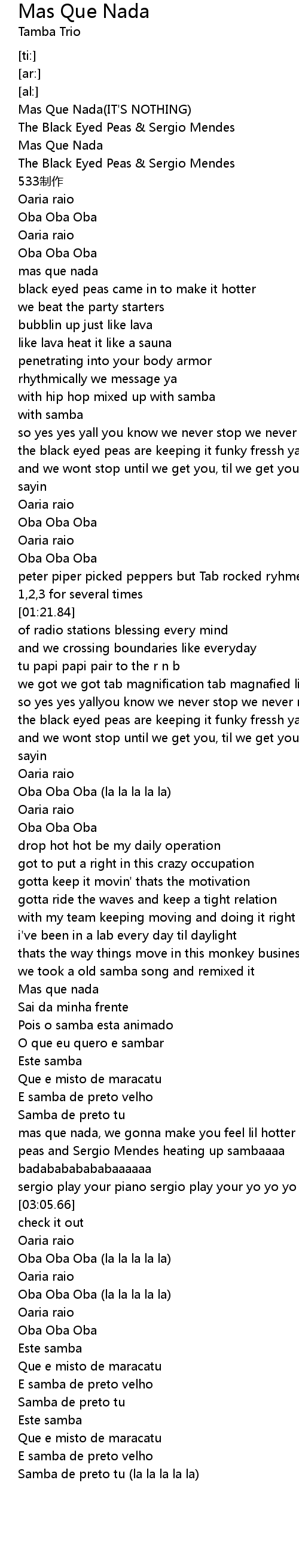 | [00:01.04] | Mas Que Nada |
