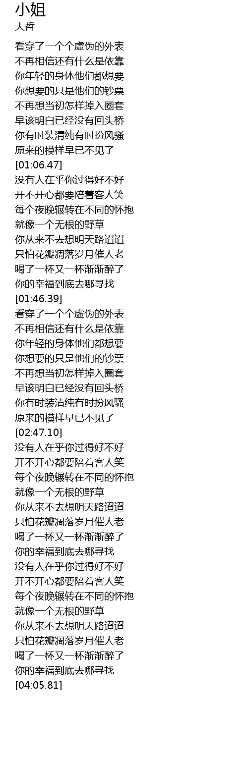 | [01:13.26] | 开不开心都要陪着客人笑 |