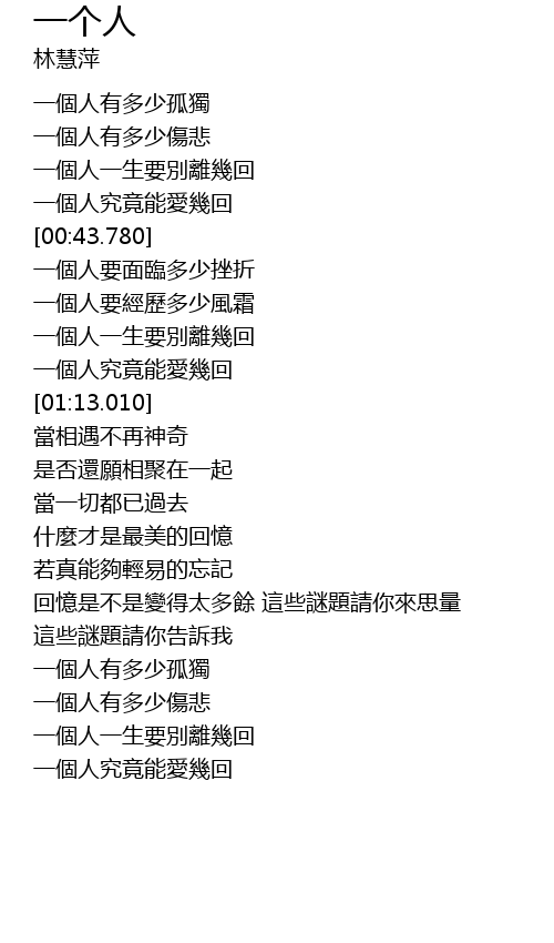 | [00:22.040] | 一個人有多少傷悲 |