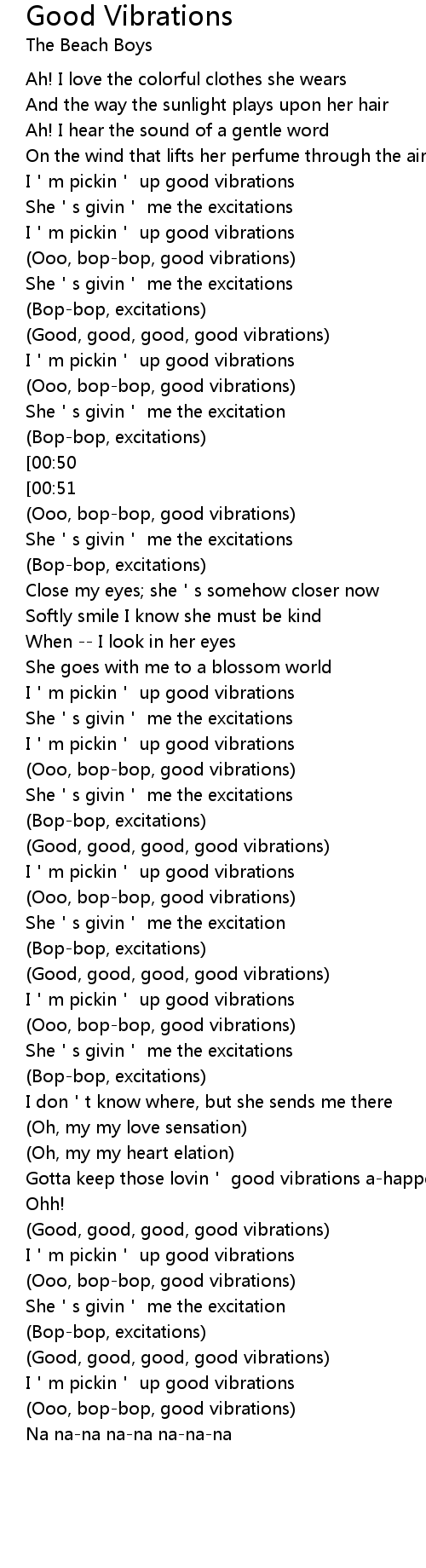 | [02:21] | Gotta keep those lovin good vibrations ahappenin with her |