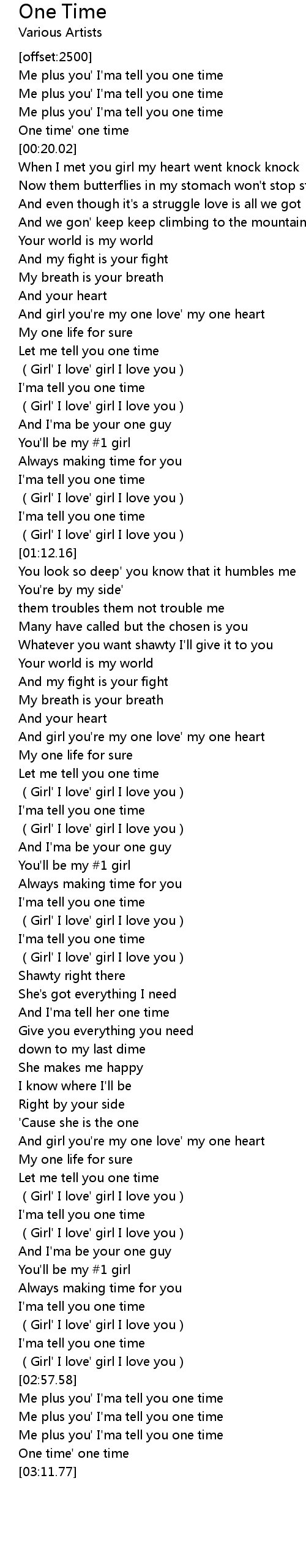 | [03:01.76] | Me plus you' I'ma tell you one time |