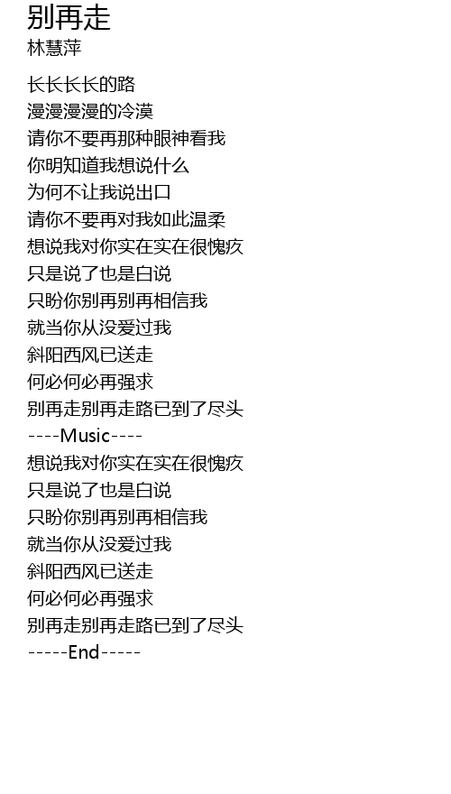 | [01:58.75] | bié zài zǒu bié zài zǒu lù yǐ dào le jìn tóu |