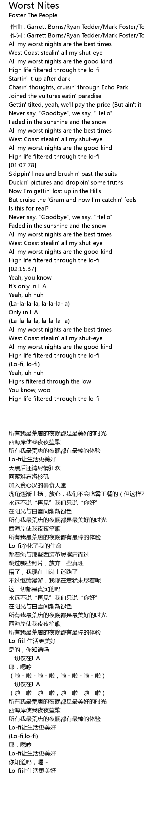 | [00:00.009] | zuo ci : Garrett Borns Ryan Tedder Mark Foster Tom Schleiter |