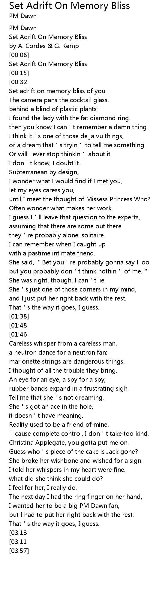| [03:21][03:11][03:01][02:52] | Set adrift on memory bliss of you |