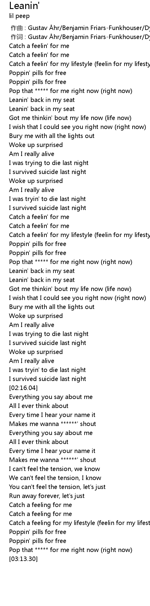 | [02:13.05] | I survived suicide last night |