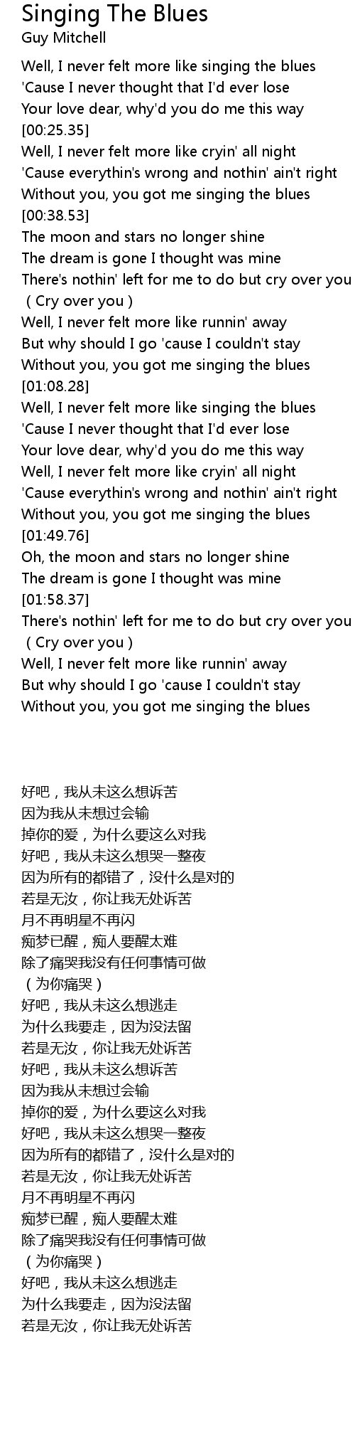 | [01:24.45] | Well, I never felt more like singing the blues |