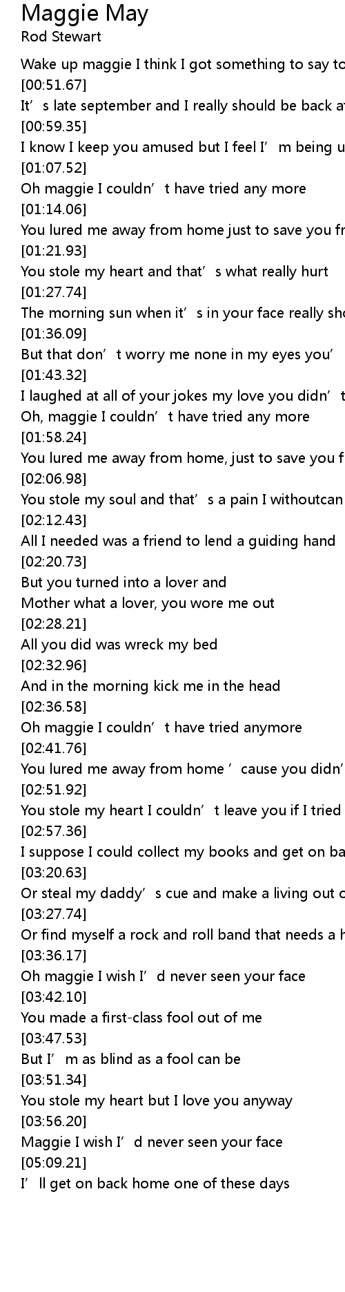 | [03:37.42] | Oh maggie I wish I' d never seen your face |