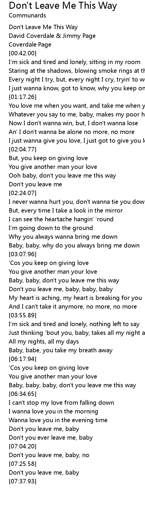 | [02:14.42] | Ooh baby, don't you leave me this way |