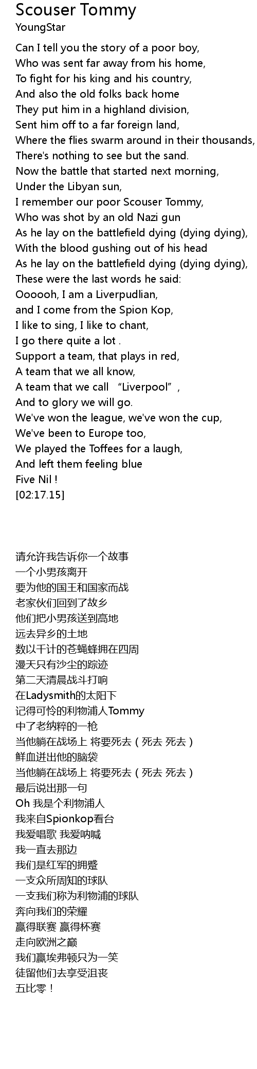 | [00:58.86] | I remember our poor Scouser Tommy, |