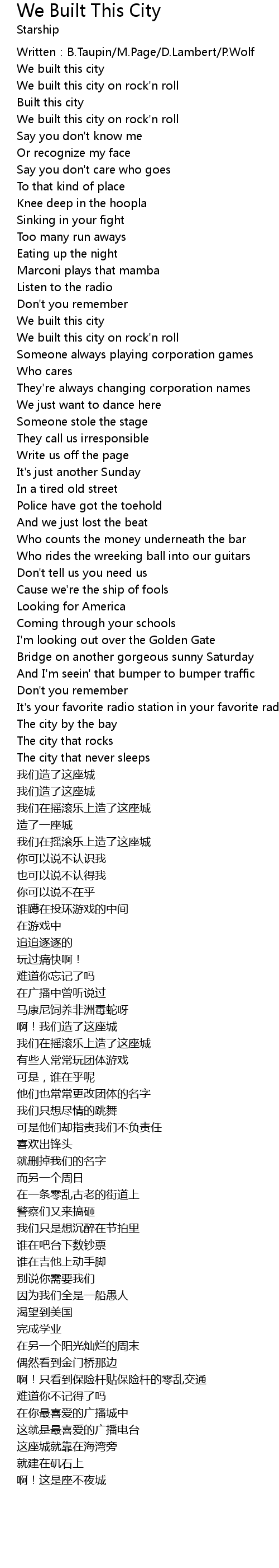 | Song | We Built This City |