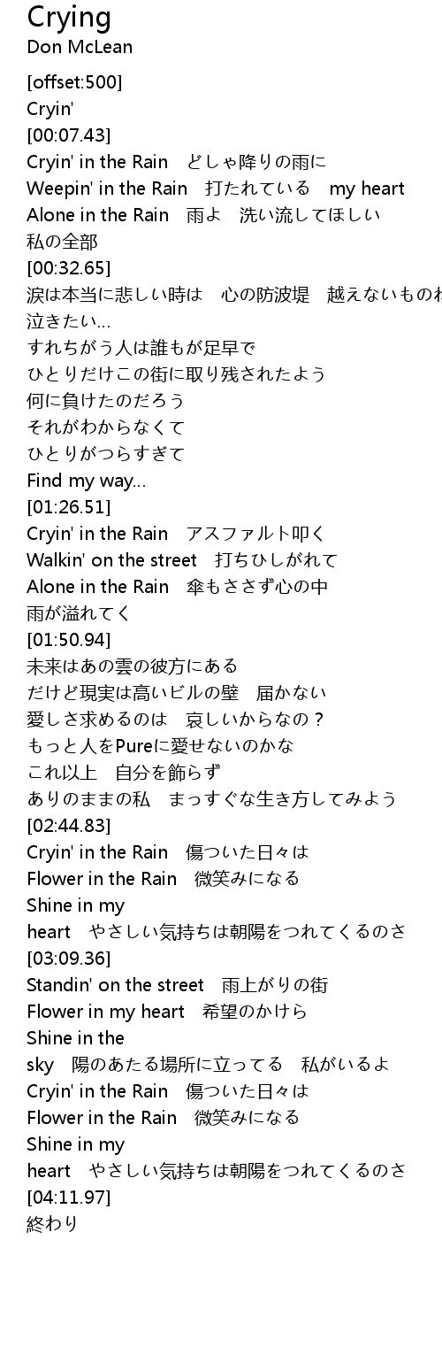 | [00:08.52] | Cryin' in the Rain どしゃ降りの雨に |