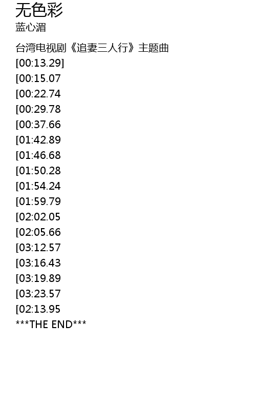 | [03:05.05][02:05.66][01:06.78] | 無色彩 呼呼的愛 深深扣住不分開 |