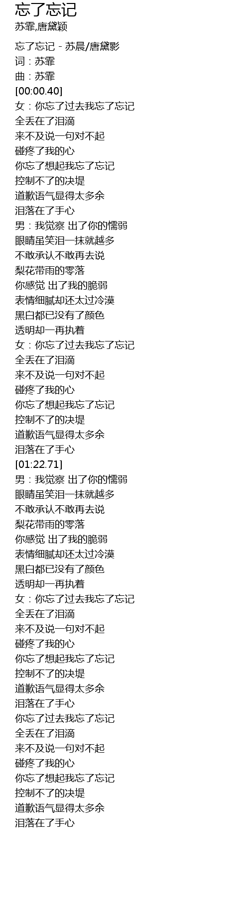 | [01:56.01] | 女:你忘了过去我忘了忘记 |