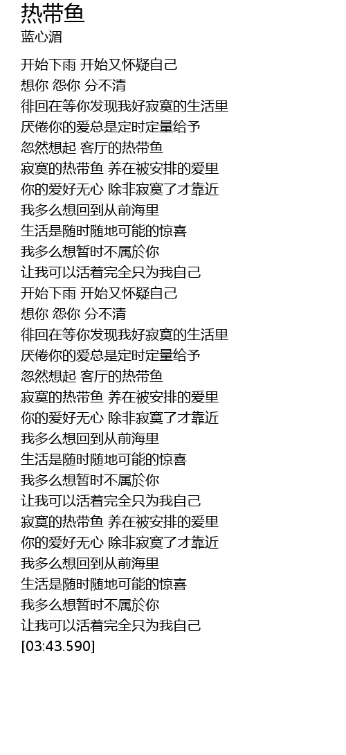 | [03:08.010] | 寂寞的热带鱼 养在被安排的爱里 |