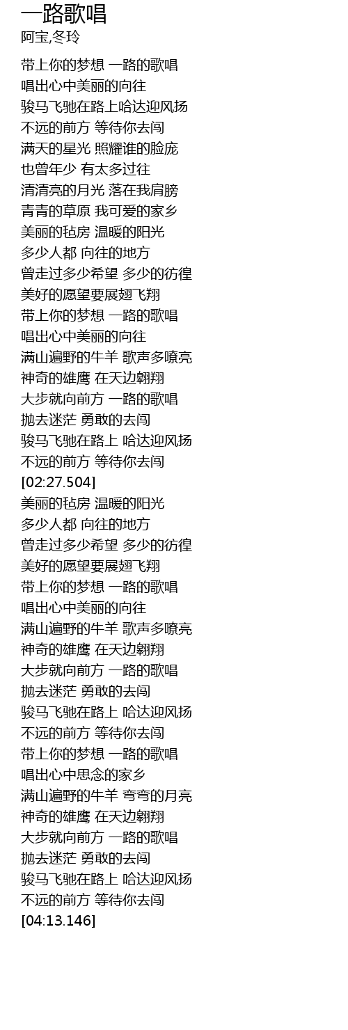 | [04:04.496] | 骏马飞驰在路上 哈达迎风扬 |