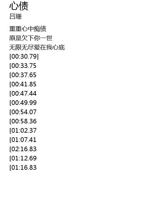 | [01:08.86][02:16.83] | 原来今生心债 |