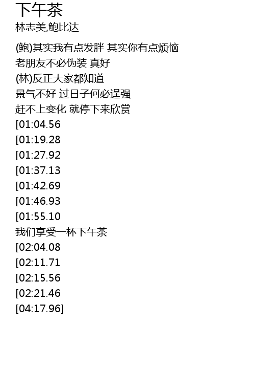 | [03:25.72][01:42.69] | 我们一起喝杯下午茶 |