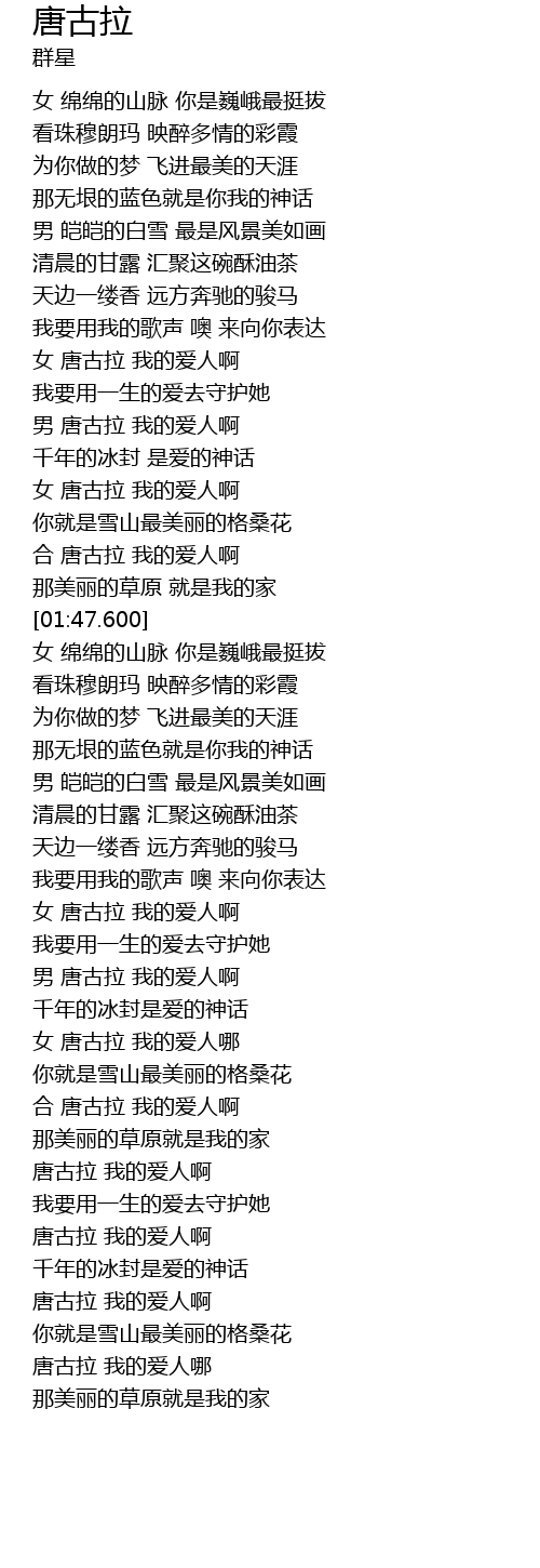 | [01:37.800] | 合 唐古拉 我的爱人啊 |