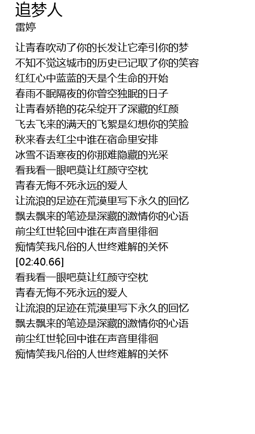 | [00:41.69] | 让青春吹动了你的长发让它牵引你的梦 |