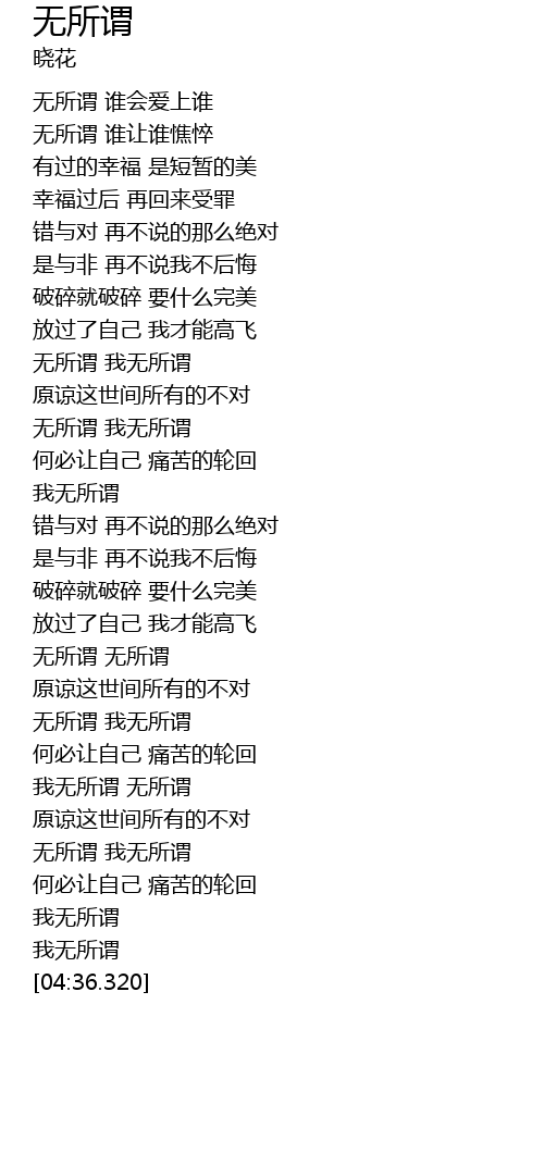 | [01:37.380] | wú suǒ wèi wǒ wú suǒ wèi |