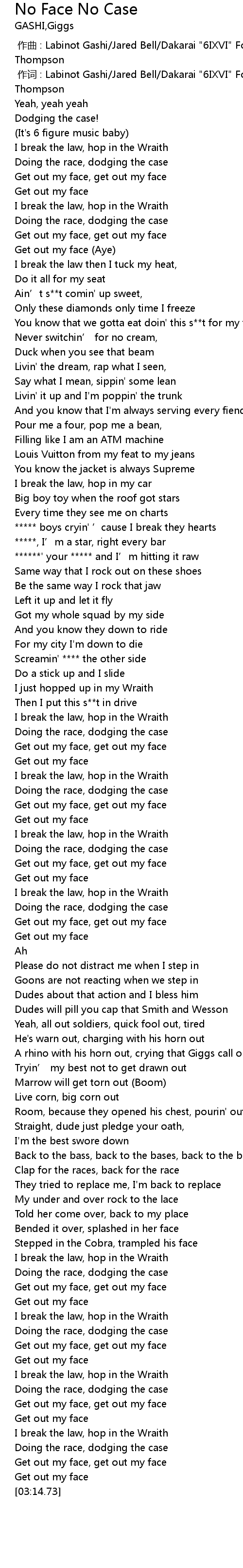 | [02:44.87] | Stepped in the Cobra, trampled his face |