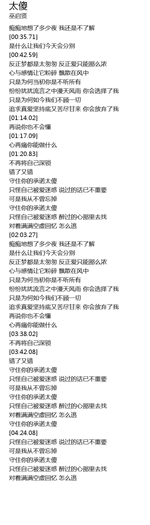 | [04:35.71] | shǒu zhù nǐ de chéng nuò tài shǎ |