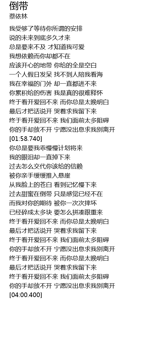 | [03:04.150] | 最后才把话说开 哭着求我留下来 |