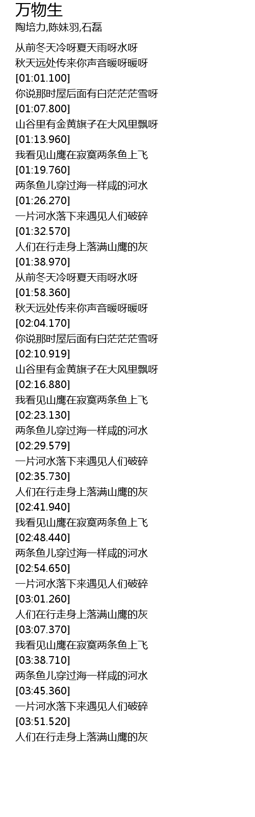 | [03:34.210] | 我看见山鹰在寂寞两条鱼上飞 |
