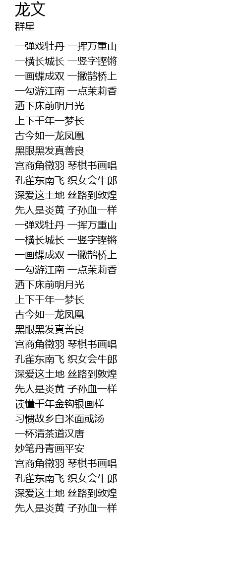 | [00:34.590] | 一横长城长 一竖字铿锵 |