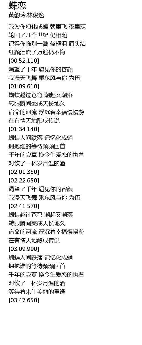 | [00:27.380] | 我为你幻化成蝶 朝里飞 夜里寐 |
