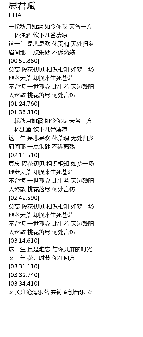 | [03:40.100] | ☆ 关注沧海乐茗 共铸原创音乐 ☆ |