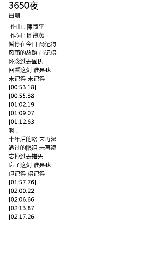 | [03:21.98][01:12.63] | 知不知 可不可 再借 这3650夜 * |