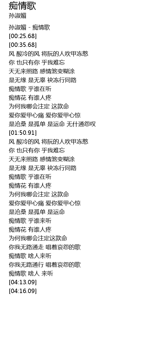 | [01:13.29] | 痴情歌 乎谁在听 |