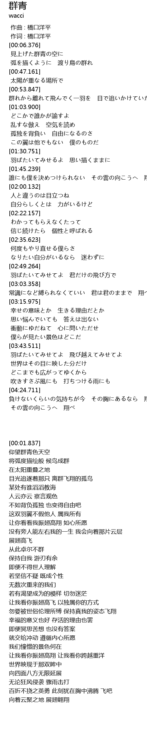 | [00:40.411] | 弧を描くように 渡り鳥の群れ |