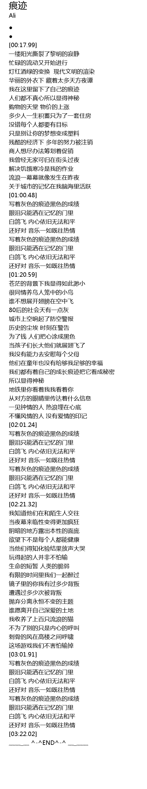 | [03:16.96] | 白鸽飞 内心依旧无法和平 |