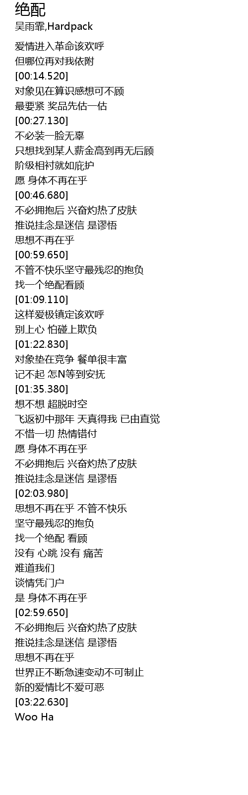 | [01:05.160] | zhǎo yí gè jué pèi kàn gù |