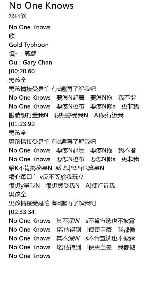 | [03:09.76] | No One Knows l若估得到 l便更自豪 我都傲 |