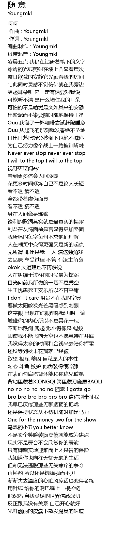 | [02:03.398] | no no no no no no 随意 I gotta go |
