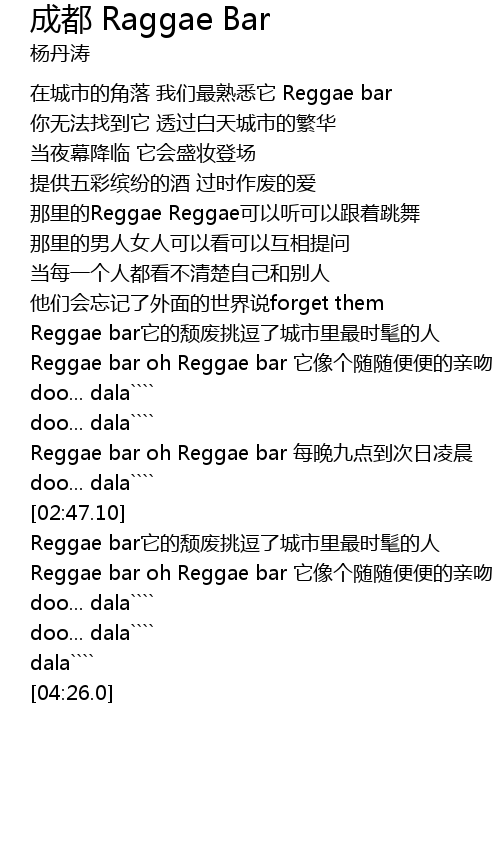 | [03:20.900] | Reggae bar oh Reggae bar ta xiang ge sui sui pian pian de qin wen |