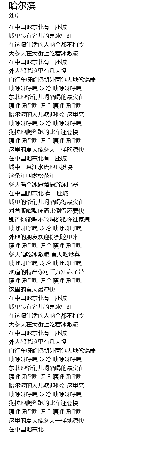 | [01:14.40] | 哈尔滨的人儿欢迎你到这里来 |