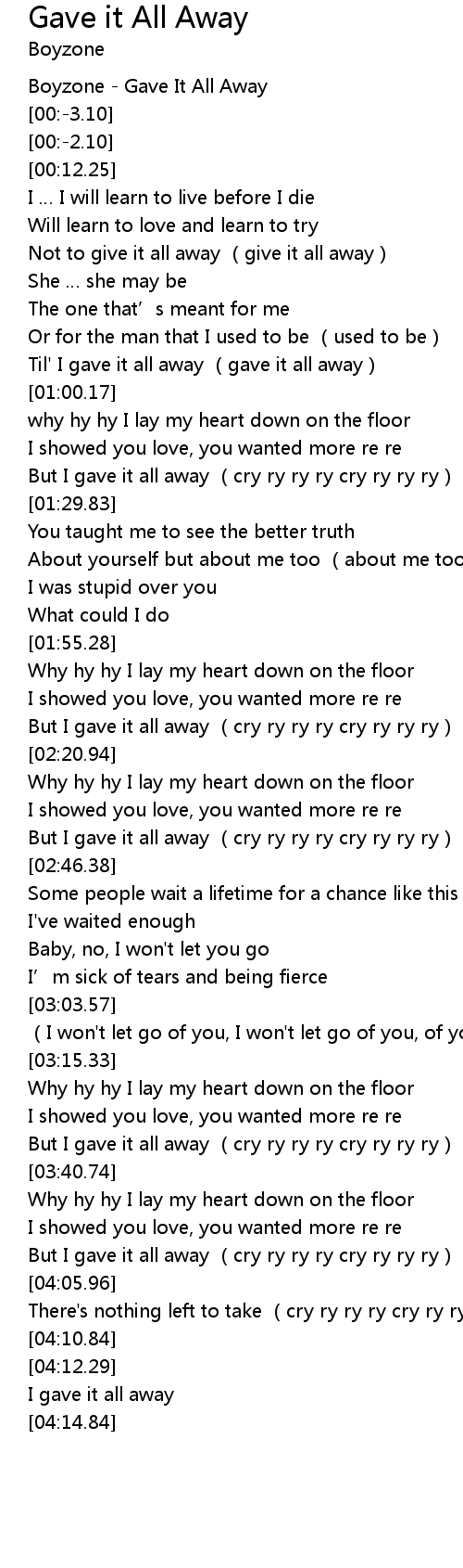 | [03:33.17] | But I gave it all away (cry ry ry ry cry ry ry ry) |