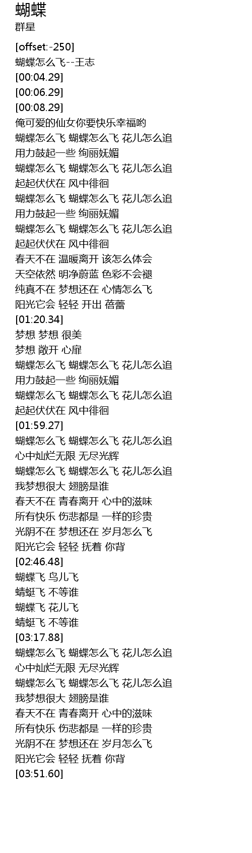 | [01:44.39] | 蝴蝶怎么飞 蝴蝶怎么飞 花儿怎么追 |