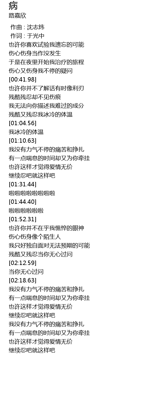 | [02:38.79] | wǒ méi yǒu lì qì bù tíng de tòng kǔ hé zhēng zhá |